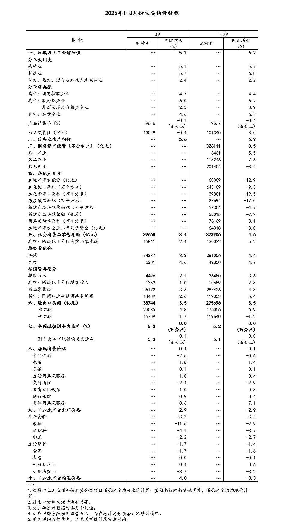 leyu乐鱼官方网站8月份,在以习同志为核心的党中央坚强领导下,各地区各部门认真贯彻落实党中央、国务院决策部署,坚持稳中求进工作总基调,完整准确全面贯彻新发展理念,加快构建新发展格局,积极强化宏观政策调节,纵深推进全国统一大市场建设,着力做强国内大循环,生产需求基本平稳,就业物价总体稳定,新动能培育壮大,国民经济保持总体平稳、稳中有进发展态势。